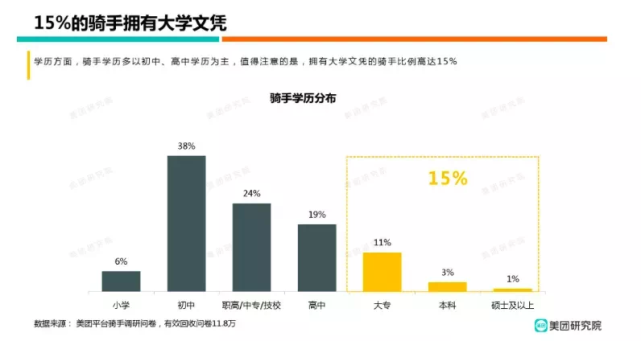 数据显示,14%的骑手学历在大专、本科,1%的骑手学历在硕士及以上。