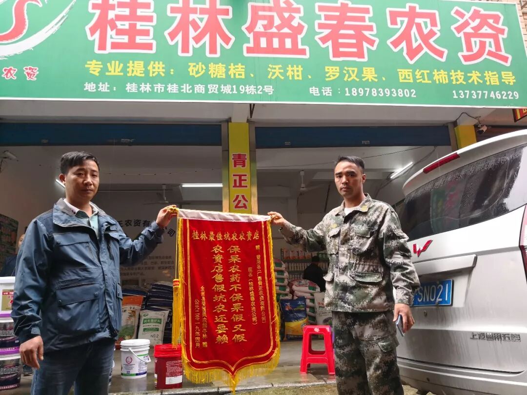4月13日,桂林市灵川县八里街的桂北商贸城内发生一件奇事,一位自称全州受害果农的熊冬林给商贸城内的广西青正农资有限公司(现名桂林盛春农资)送了一面锦旗,写着“桂林最佳坑农农资店”。还给灵川县农业农村局送了一面“踢皮球先进单位”的锦旗。具体情况,详见下文。